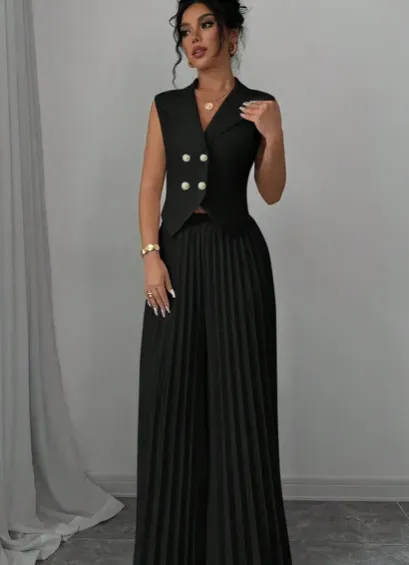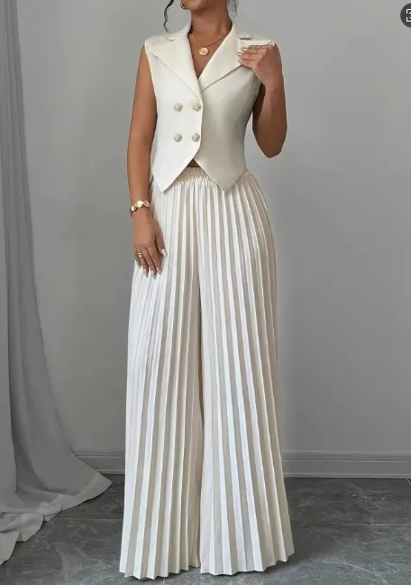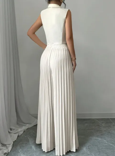 Summer Sleeveless Suit Fashion Lapel Button Vest Top And Pleated Straight Pants Women's Trousers Set Clothing